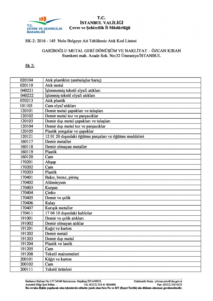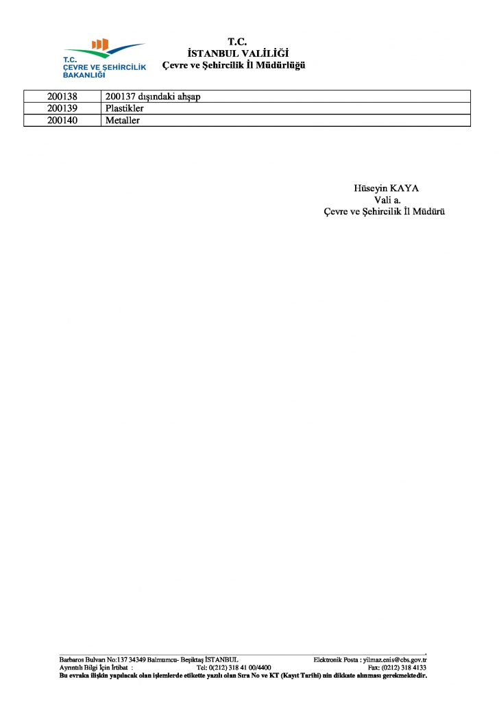 T.C. İstanbul Valiliği Çevre ve Şehircilik İl Müdürlüğü Tarafından Verilen Tesise Kabul Edilecek Tehlikesiz Atık Listesi