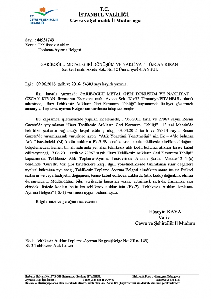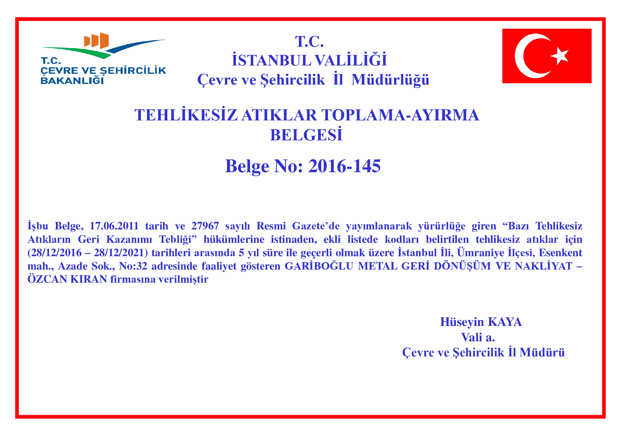 T.C. İstanbul Valiliği Çevre ve Şehircilik İl Müdürlüğü tarafından 2016 yılında verilen Tehlikesiz Atıklar Toplama-Ayırma Belgesi